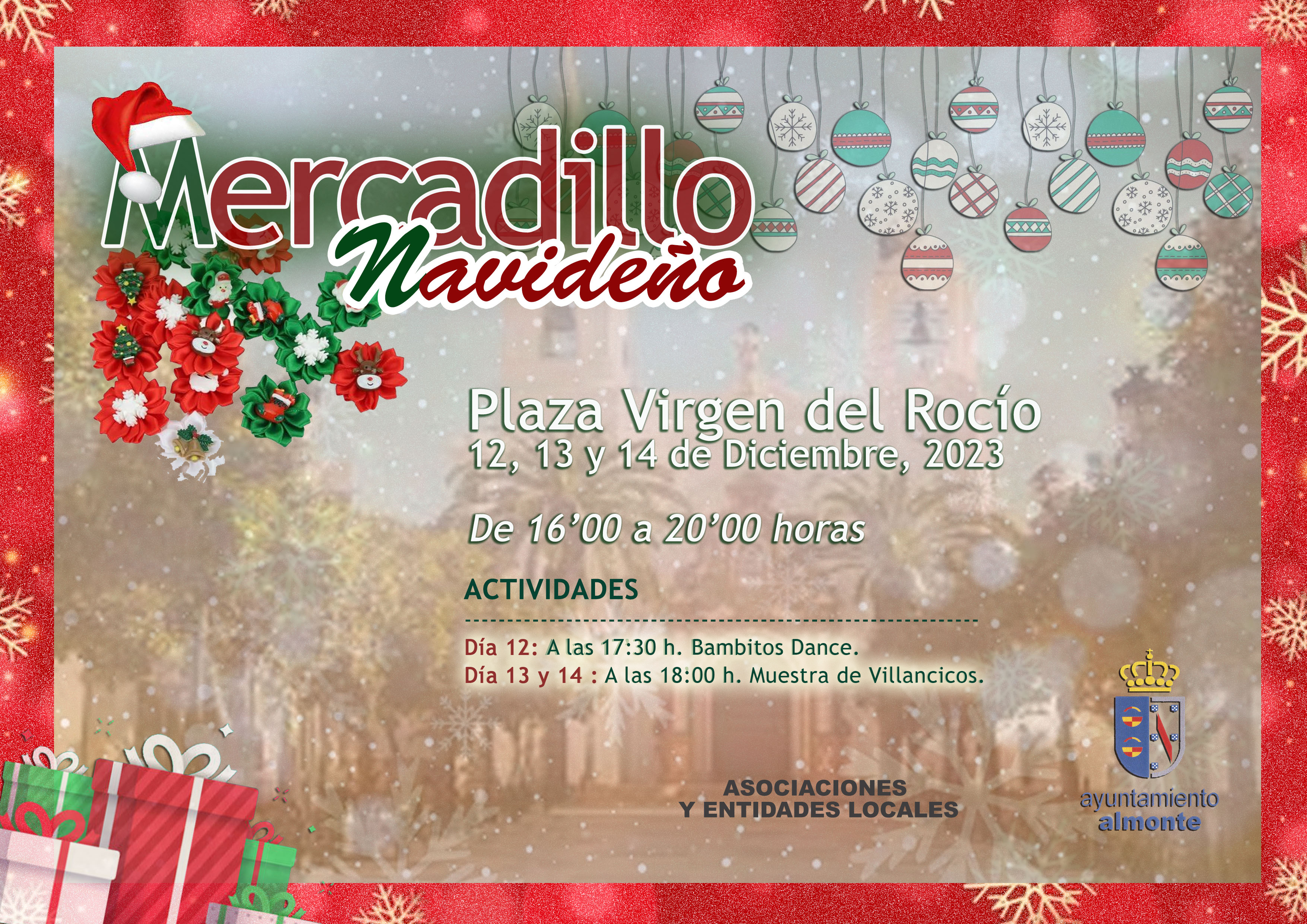 Descargar Pdf Del 12 al 12 de diciembre de 2023 MERCADILLO NAVIDEÑO Y ACTUACIÓN DE BAMBITOS DANCE. Descargar Pdf Información del evento Lugar: Plaza Virgen del Rocío en Almonte Inicio: 12 de diciembre de 2023 | 16:00 Finalización: 12 de diciembre de 2023 | 20:00 Mercadillo Navideño.16:00h a 20:00h en la Plaza Virgen del Rocío. A las 17:30 h. Bambitos Dance.