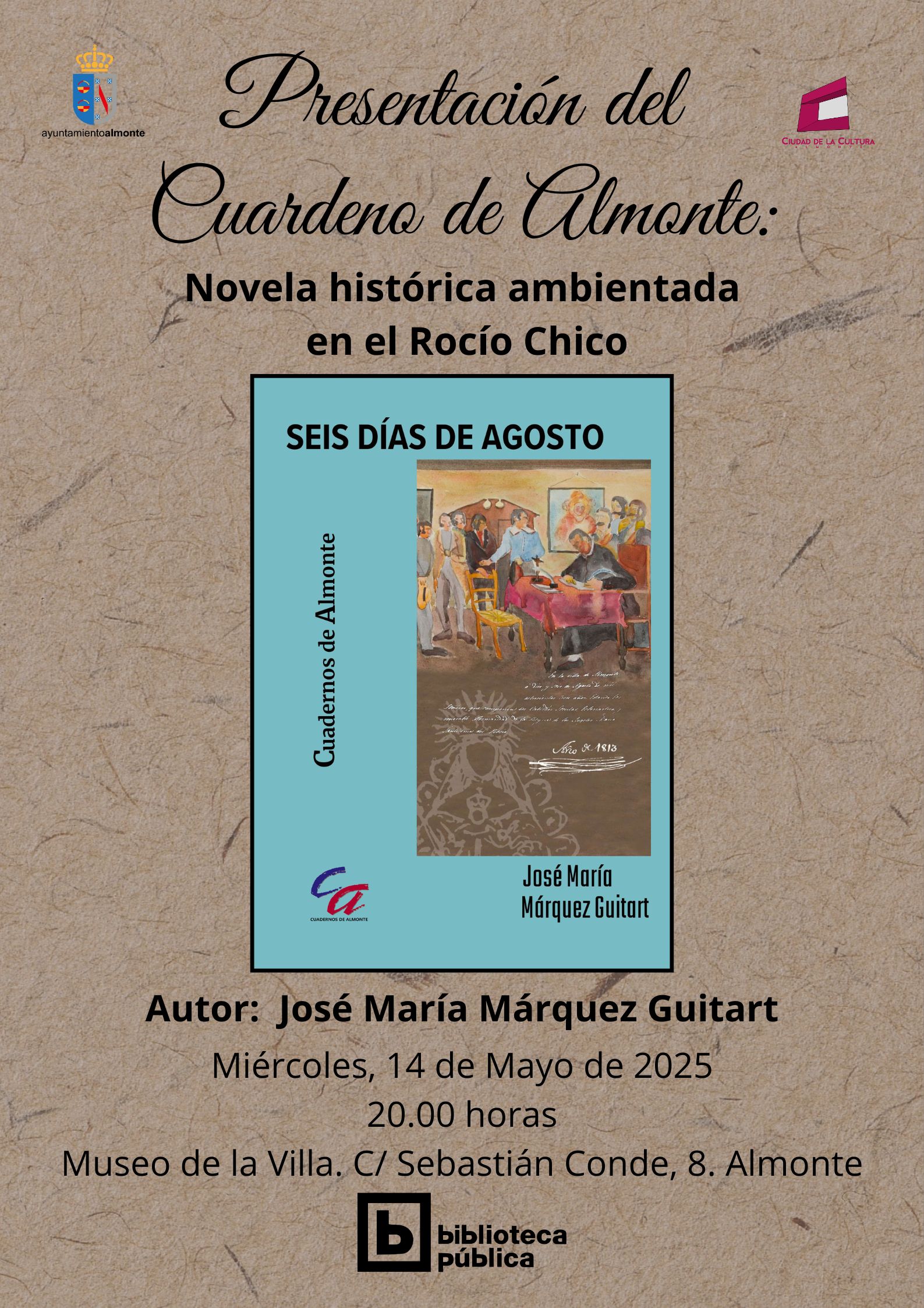 El próximo miércoles 14 de mayo el Ayuntamiento de Almonte aporta un título más a la colección "Cuadernos de Almonte" que en este caso trata de un importante acontecimiento de nuestra historia local surgido en 1810. Una novela histórica basada en esos hechos que dieron origen al Rocío Chico, obra del almonteño José María Márquez.