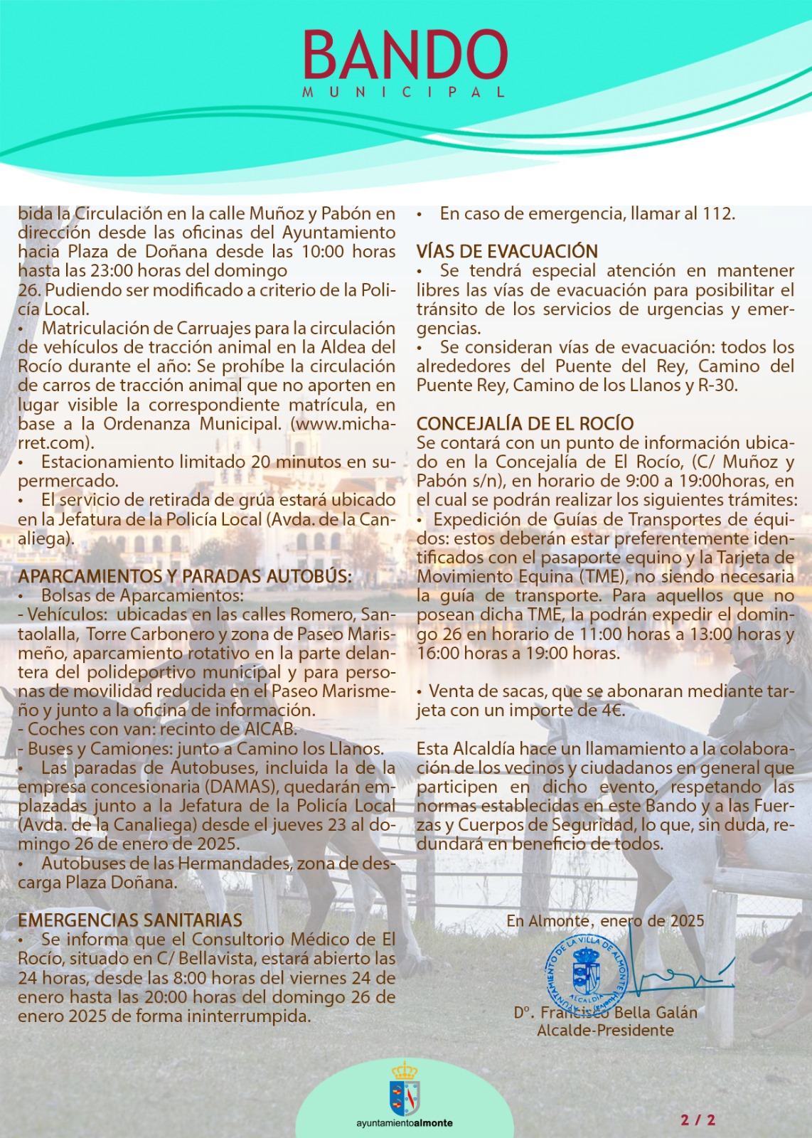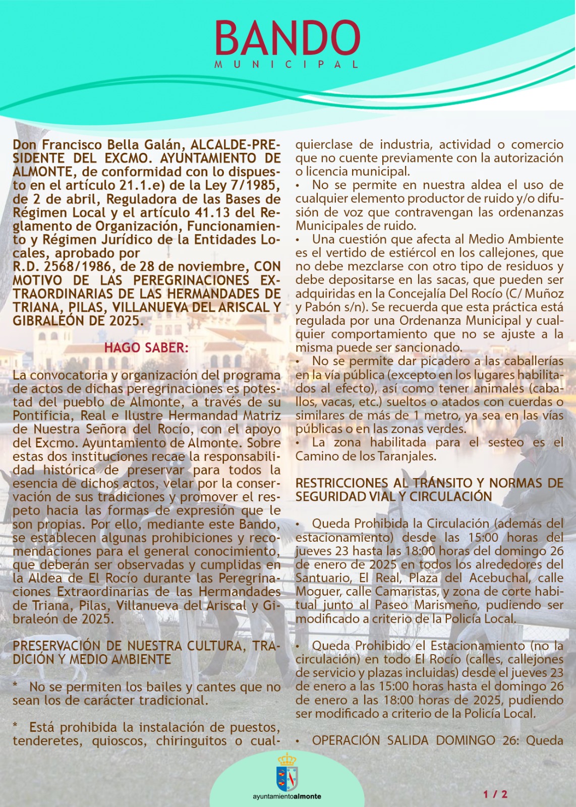 Mediante este Bando, se recuerdan algunas prohibi­ciones y recomendaciones para el general conoci­miento, que deberán ser observadas y cumplidas en la Aldea de El Rocío durante la Romería de 2024, que se desarrolla entre el 16 y el 20 de mayo.