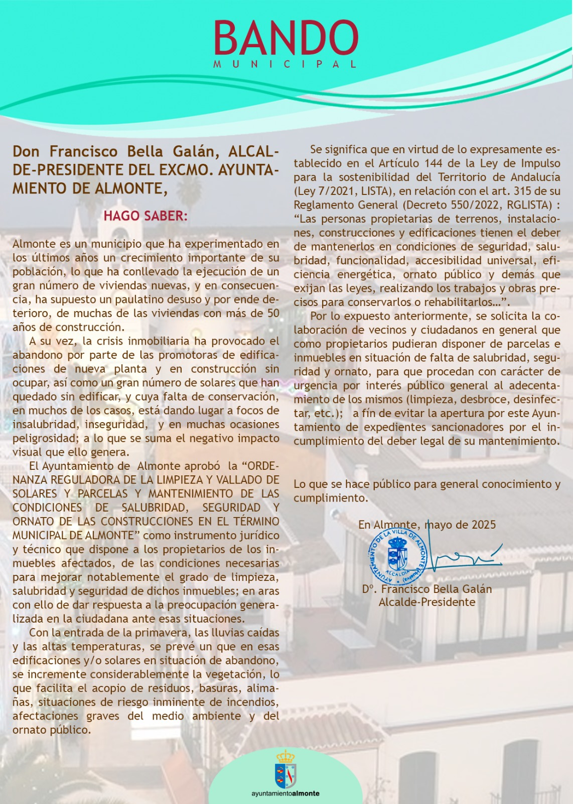 Bando sobre el mantenimiento de parcelas e inmuebles en situación de falta de salubridad, seguridad y ornato.
