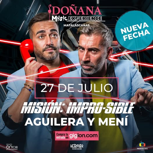 "Los artistas Javier Aguilera y Carlos Mení presentan en DOÑANA MUSIC EXPERIECE su trabajo 'Misión: Impro-sible'. Los dos cuarteteros punteros del Carnaval de Cádiz, se han consolidado como una de las parejas con más ingenio, rapidez en la improvisación y humor del panorama nacional.