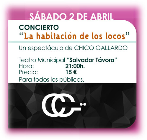 Descargar Pdf sábado, 02 de abril de 2016 CONCIERTO "La habitación de los locos" Sábado 2 de abril de 2016 21:00 h en el Teatro Municipal "Salvador Távora" de Almonte Descargar Pdf Información del evento Lugar: Teatro Municipal "Salvador Távora" de Almonte Inicio: 02 de abril de 2016 | 21:00 Sábado 2 de abril de 2016 a las 21:00h, un espectáculo de Chico Gallardo. En el Teatro Municipal "Salvador Távora" de Almonte