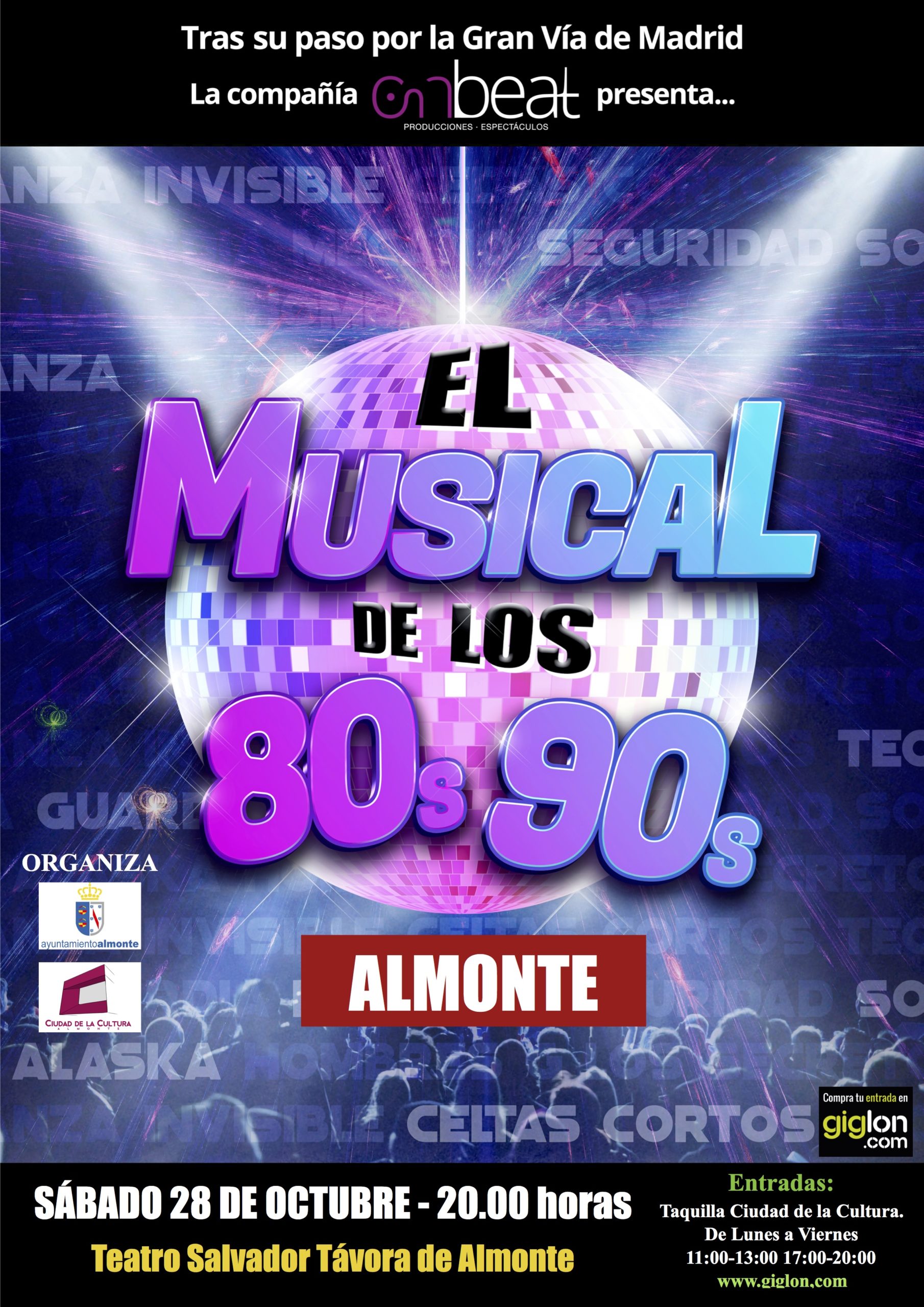 La Compañía Onbeat presenta El musical de los 80s 90s, la comedia musical original más divertida del año. El musical de una época única en el que el público compartirá la experiencia de los personajes, cantando, bailando y siendo cómplices de cada uno de ellos. El mejor pop español de los 80 y 90 se mezcla con éxitos internacionales y con las mejores canciones del verano que marcaron nuestra juventud. El musical más bailado de la historia.