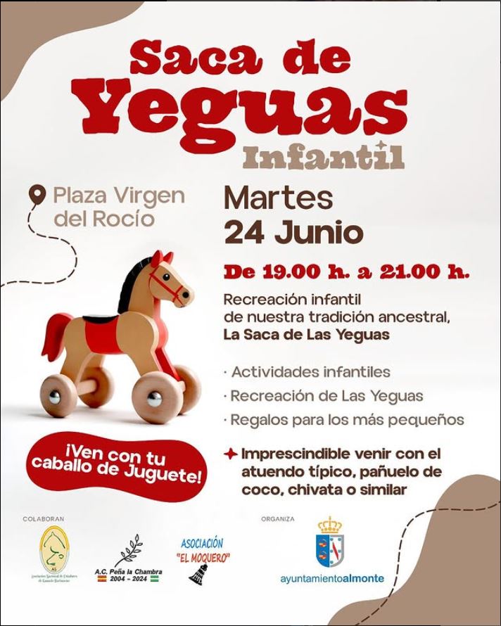 Por segundo año consecutivo, el Ayuntamiento de Almonte organiza esta actividad para que nuestros pequeños puedan vivir nuestra tradición más ancestral, LA SACA DE LAS YEGUAS, en una tarde muy especial en la plaza Virgen del Rocío.