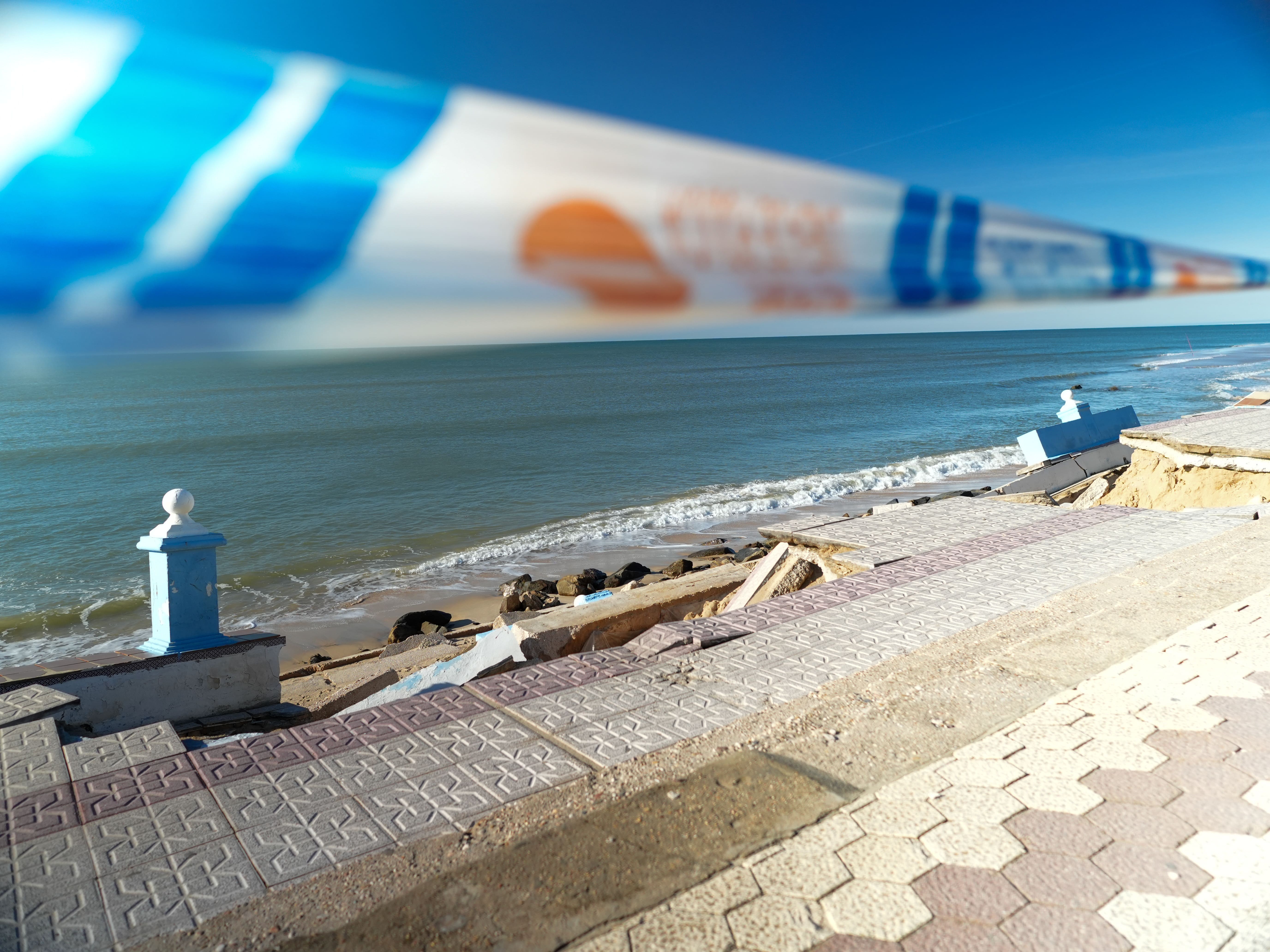 El documento detalla que más de un kilómetro del paseo marítimo presenta roturas, hundimientos, pérdida de firme y tramos completamente inestables. Existen zonas donde el colapso de la estructura es inminente y otras en las que el daño es prácticamente total, generando un riesgo real para la seguridad de las personas y comprometiendo la estabilidad de infraestructuras situadas en primera línea. La pérdida continuada de arena en la playa, agravada por el retraso en la ejecución del proyecto estatal de aportación de sedimentos previsto para esta costa, ha dejado desprotegido el frente litoral y ha acelerado el avance de la erosión sobre el paseo marítimo.