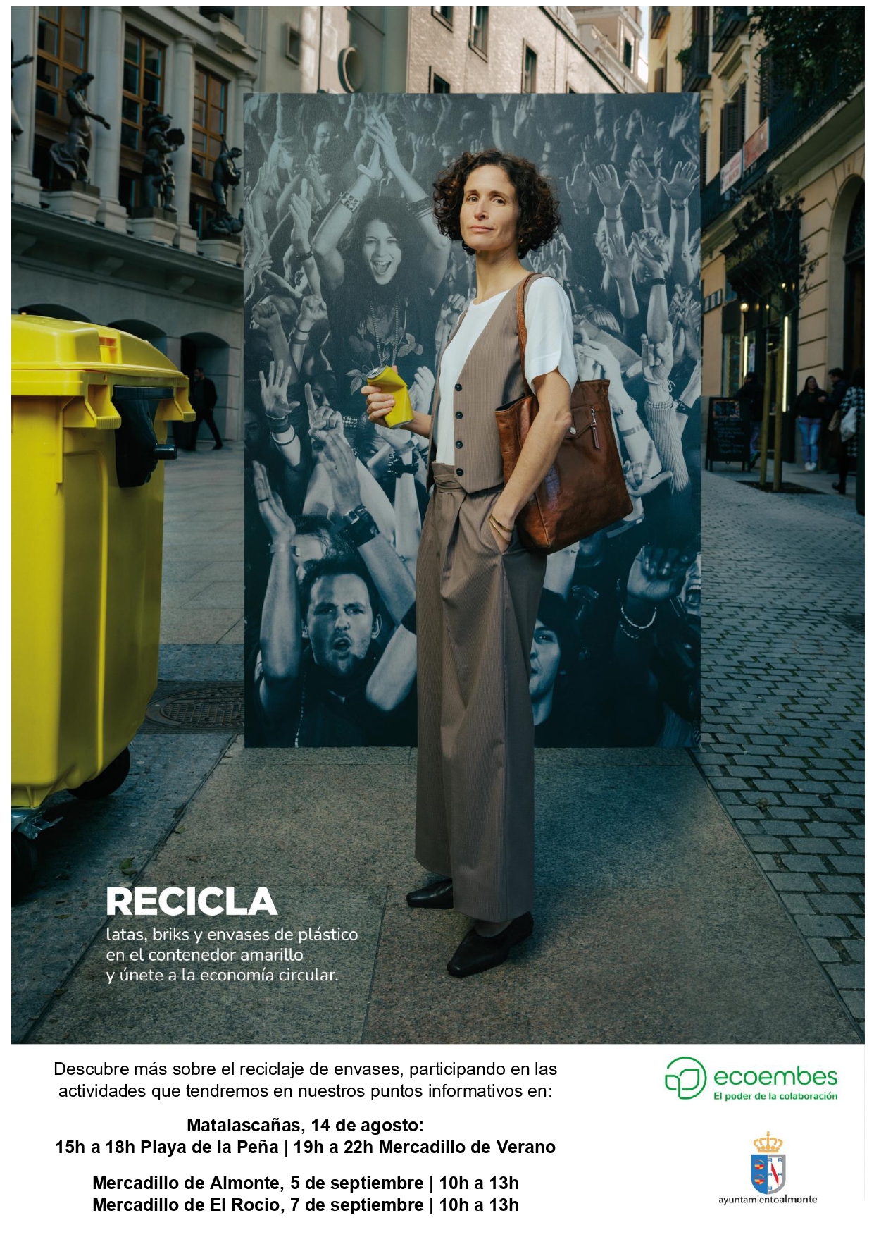 Descargar PdfUn año más se pone en marcha la Campaña “Recicla y únete al movimiento circular” por parte del Ayuntamiento de Almonte y Ecoembes. Esta campaña se desarrollará durante el mes de agosto y comienzos de septiembre.