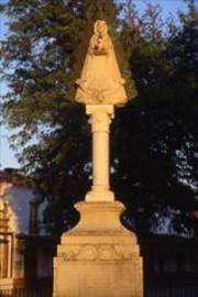“Sobre una doble gradería se alza sencillo pedestal de piedra caliza que sirve de sostén a una pequeña columna de mármol blanco, sobre la que se asienta una reproducción, también en piedra, de la Sagrada Imagen con corona y ráfagas de hierro forjado. En la cara anterior del basamento se halla esculpida la siguiente inscripción: