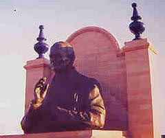 Escultura en bronce con un pedestal de mampostería que representa al Papa Juan Pablo II. Se conmemora la visita que hizo S.S. el junio de 1993 a la Aldea de El Rocío.